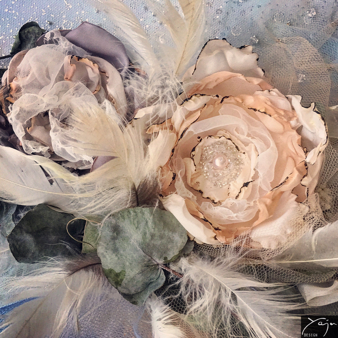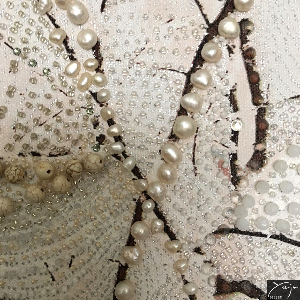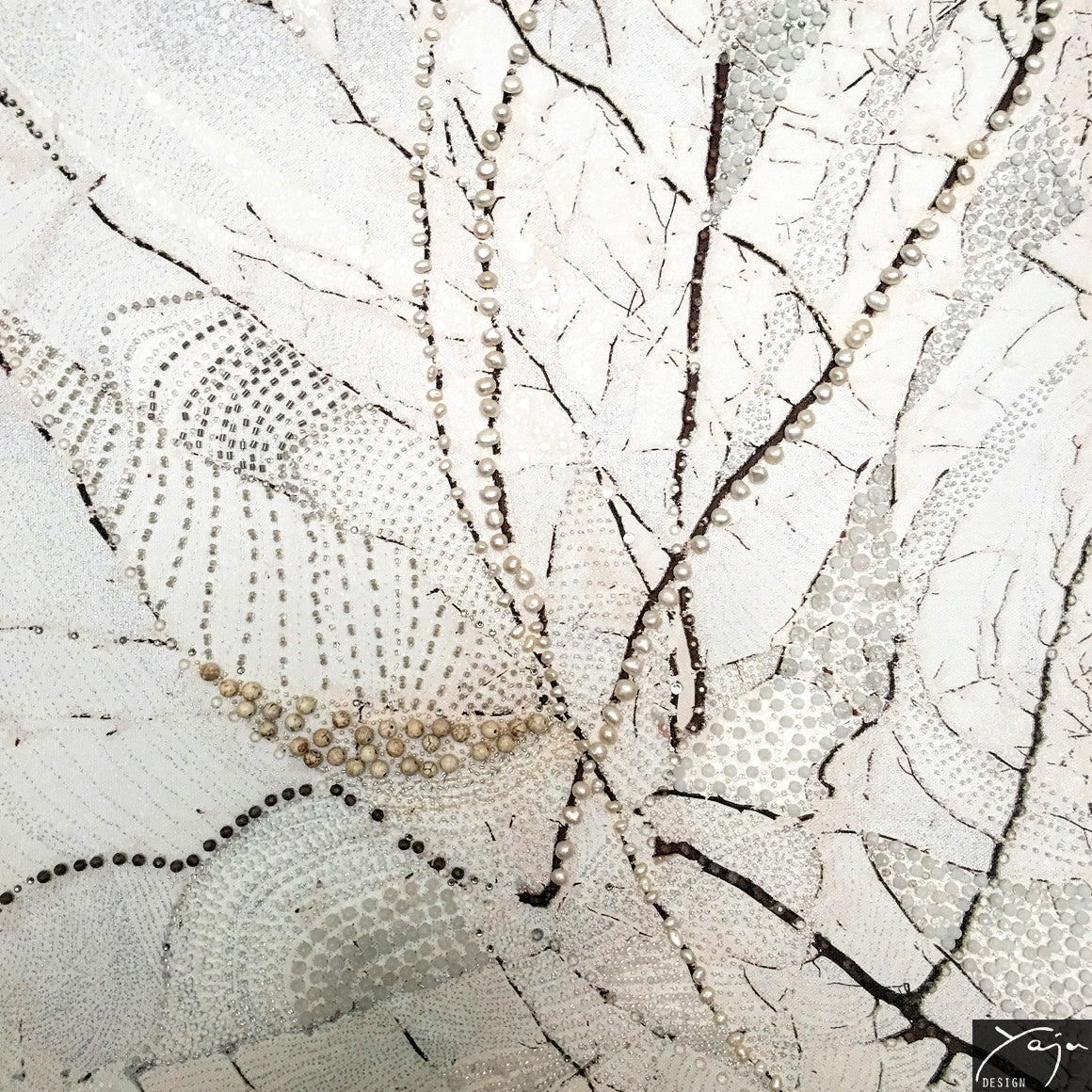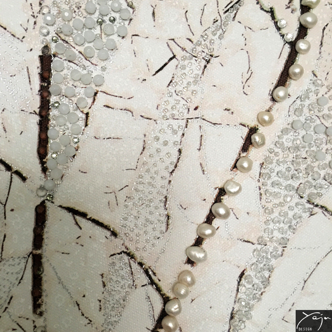 Photograph of snow patterns digitally printed on canvas. Then painted with silver pen and embroidered with genuine pearls, gemstones, Swarovski crystals and beads. Stretched canvas 35x35cm