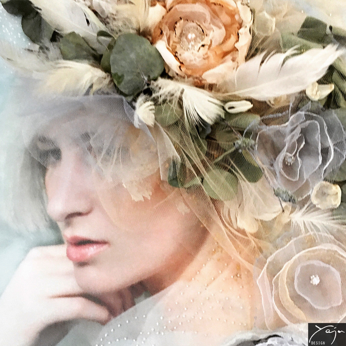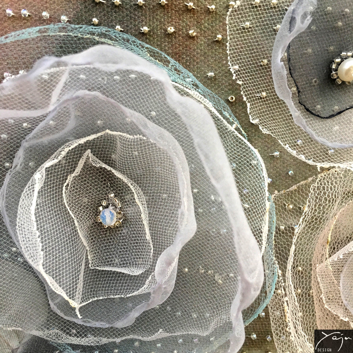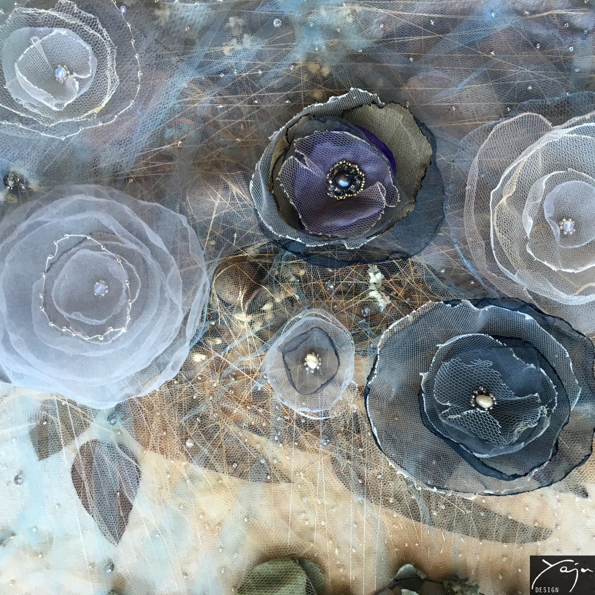 Digital print on canvas, silk & polyester organza, eco dyed silk, tulle, leaves, seeds, embroidered with genuine pearls, Swarovski crystals and beads. The beloved Polish forest of my childhood and...