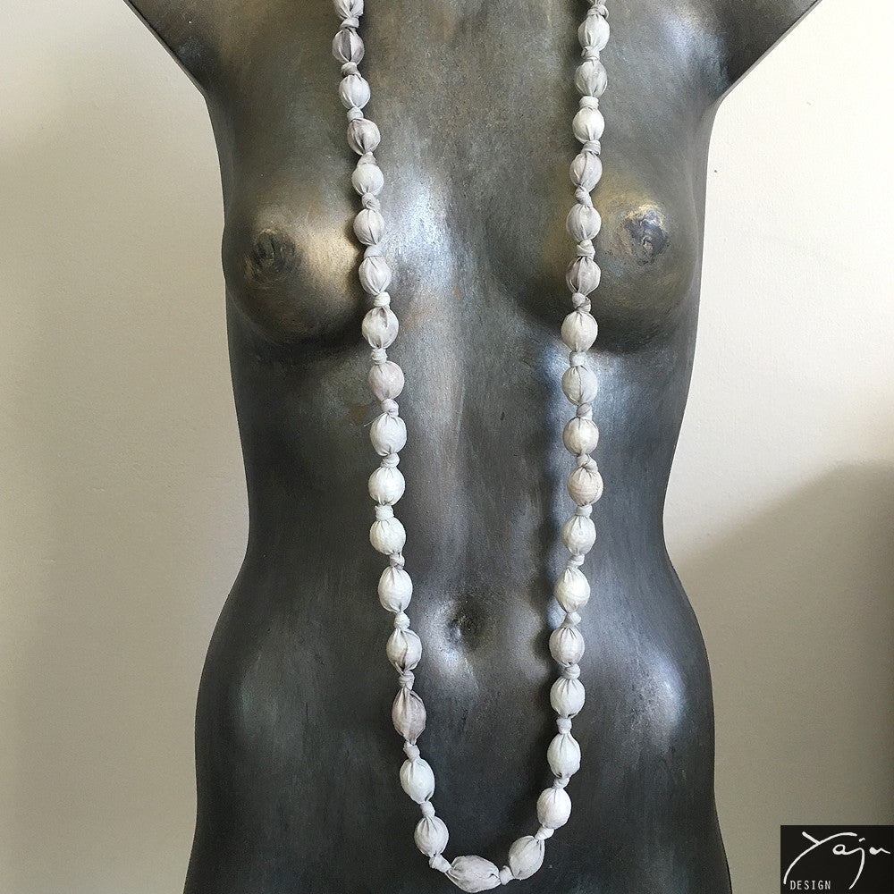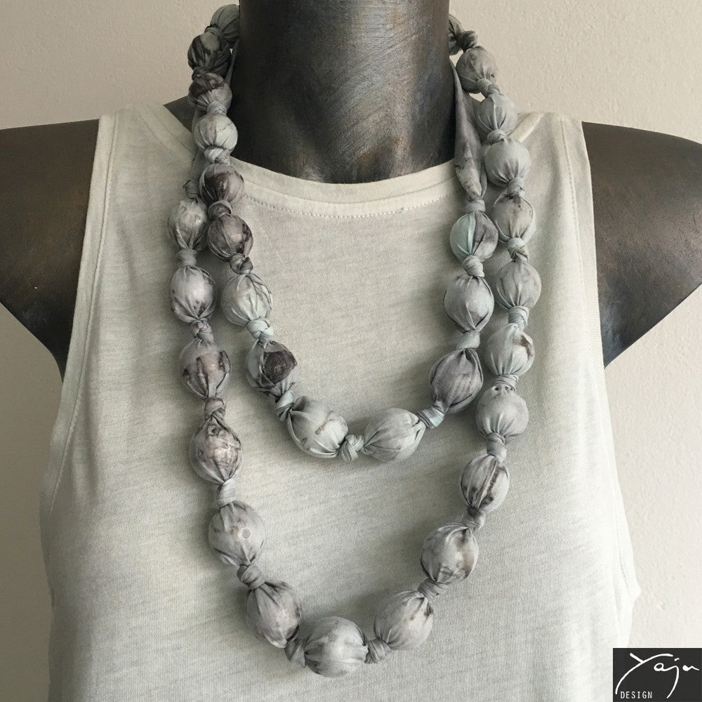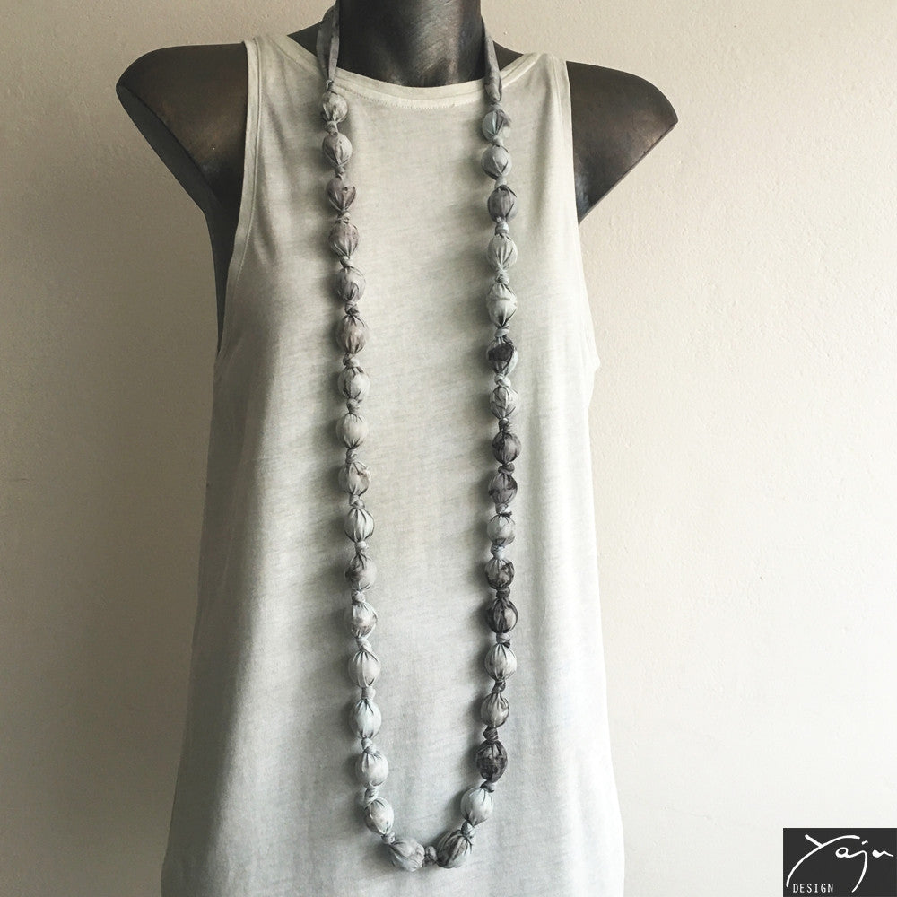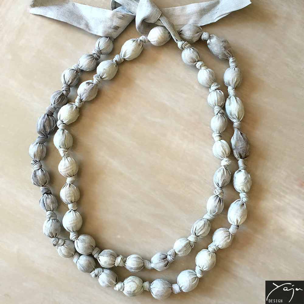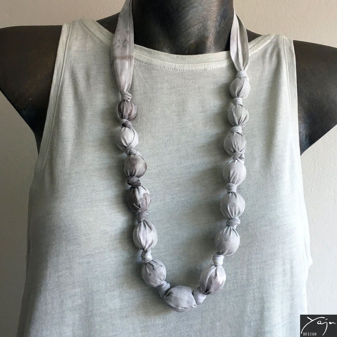 Large beads necklace I made of pure cotton hand dyed first using eucalyptus leaves collected in the Australian bush. The subtle palette of various shades of grey creates images of an overcast sky...