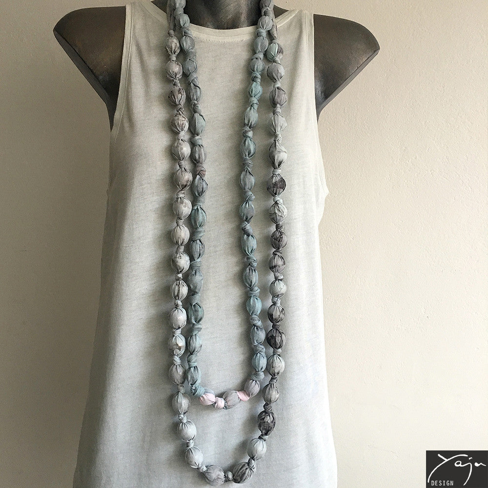 Medium beads necklace is made of pure cotton which I hand dyed first using eucalyptus leaves collected in the Australian bush. Handcrafted in Australia One of a kind Length: 84cm (adjustable) The soft grey palette with...