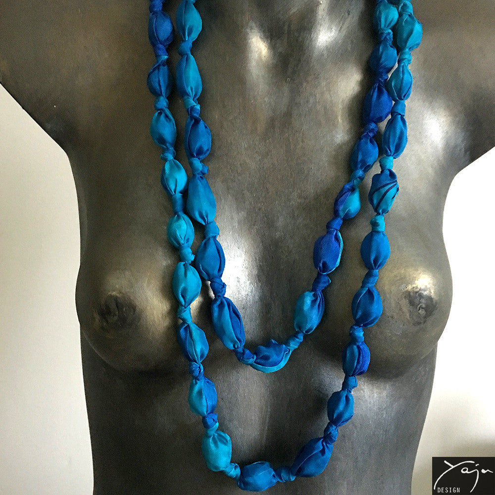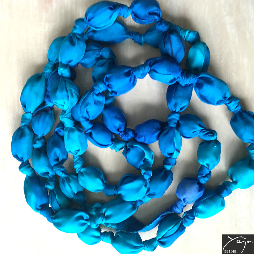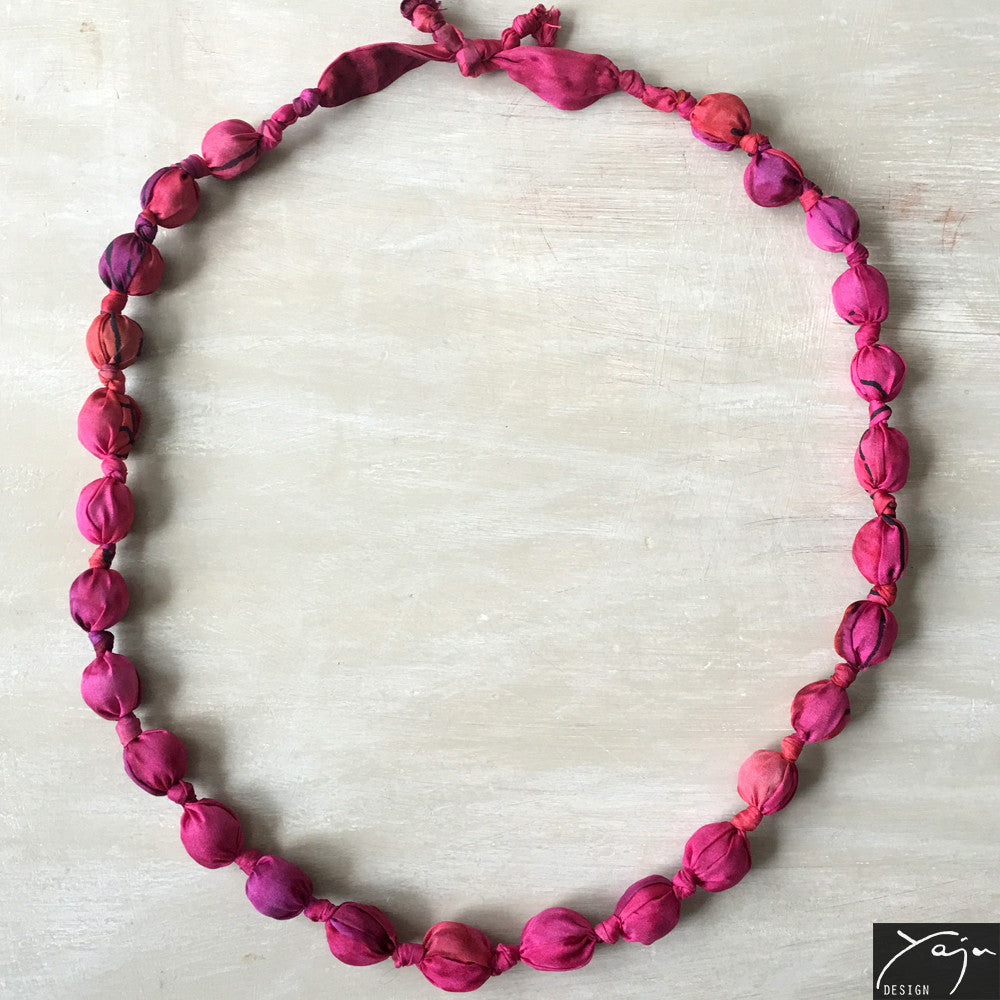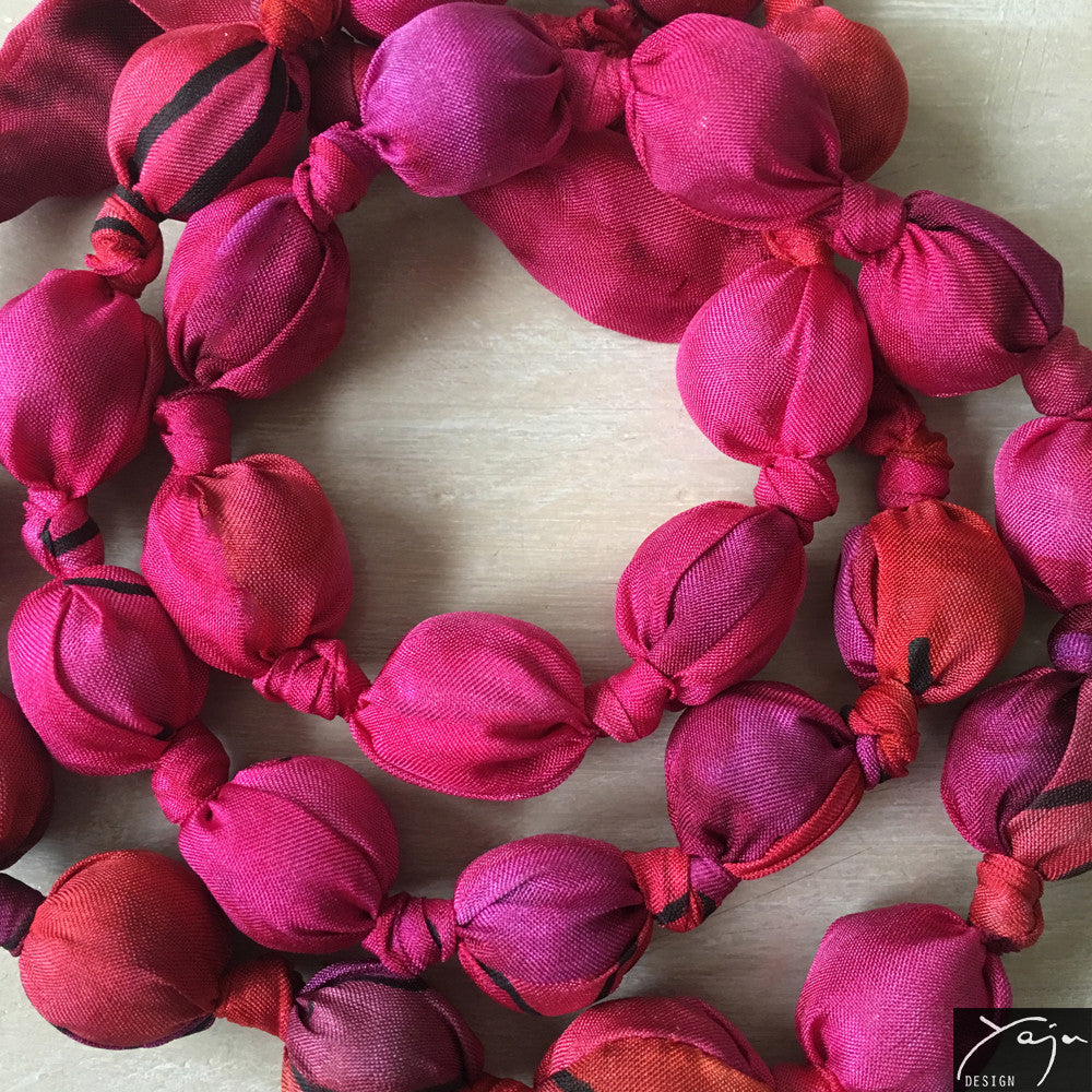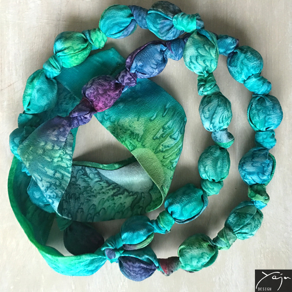 Medium beads made of hand dyed and then screen printed silk. Length: 179cm