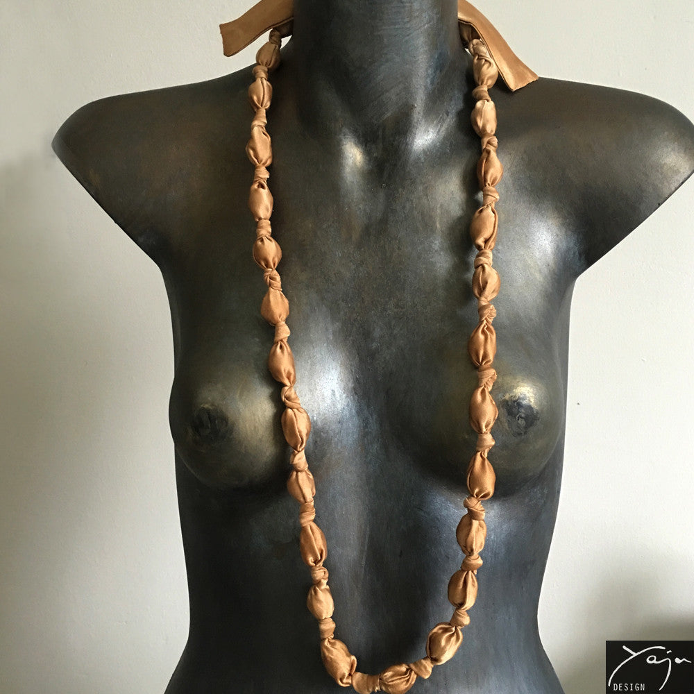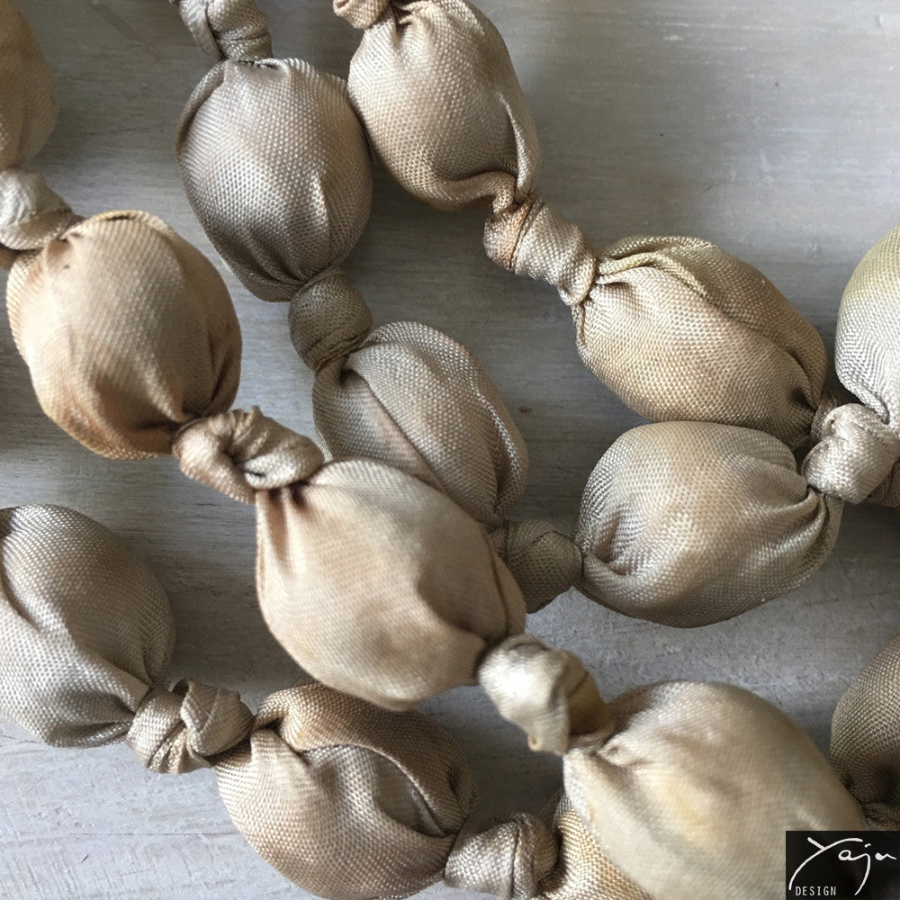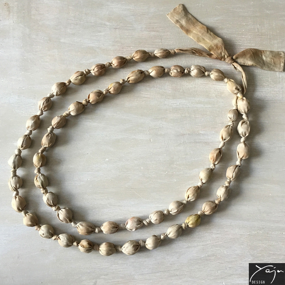 Large silk beads hand dyed using eucalyptus leaves. Length: 136cm.
