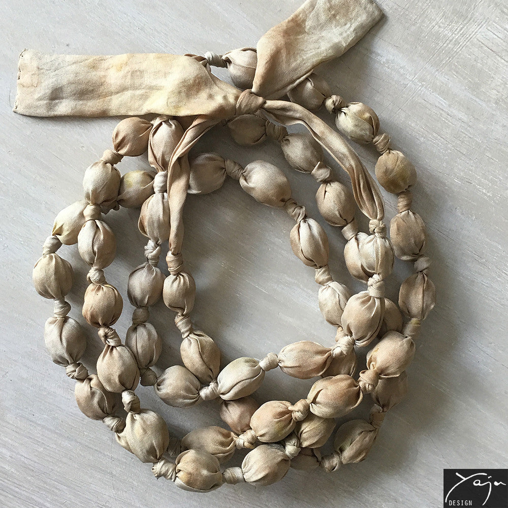 Medium size beads I made of pure cotton which I hand dyed first using eucalyptus leaves. Subdued greys and beiges in the necklace suggest images of a stormy summer day on Curl...
